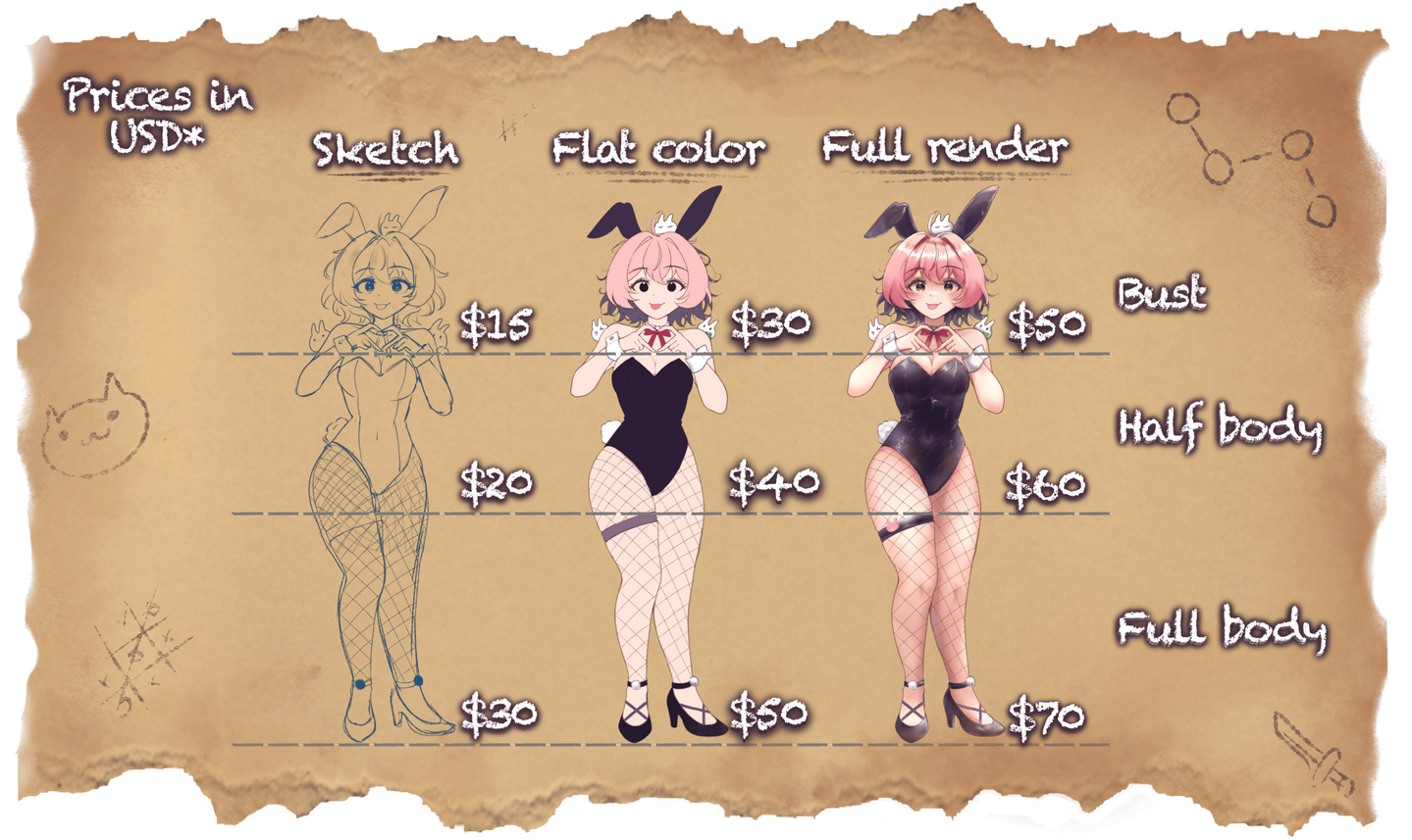 Extra character: +50% price of characterAlternative outfit/version: +$40NSFW: +20% of base priceFace variants: +$10 for 3Commercial use: +200%Prices are in USD ,writing this again so mobile users can see